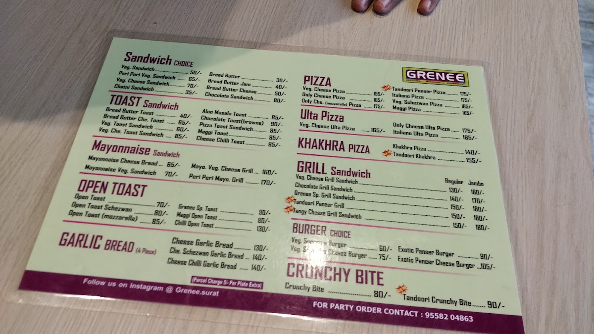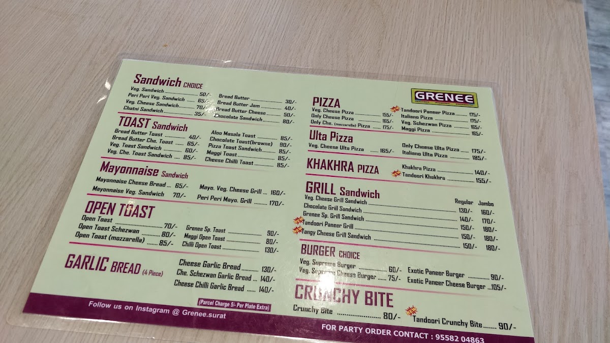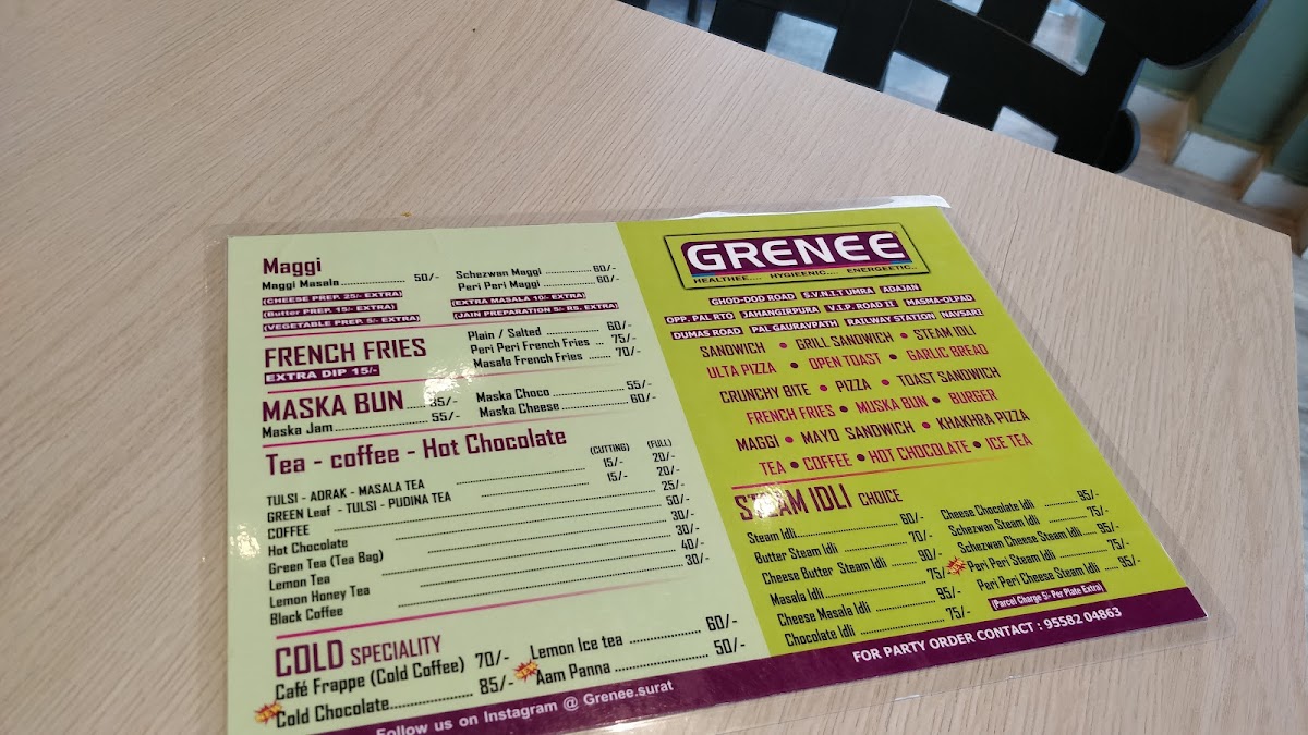 Welcome to GRENEE, the charming café located in Vyara, Gujarat, where delightful flavors await. The menu is a testament to culinary creativity, featuring an impressive selection of cold specialties such as Café Frappe and Lemon Ice Tea, perfect for refreshing sips.
